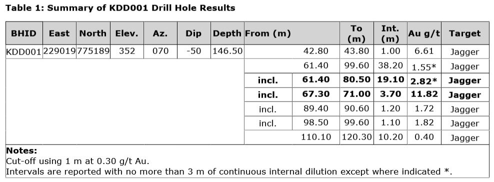 KDD001: 38.20 metres ("m") at 1.55 g/t* Au from 61.40 m, including 19.10 m at 2.82 g/t* Au from 61.40 m and 3.70 m at 11.82 g/t Au from 67.30 m
