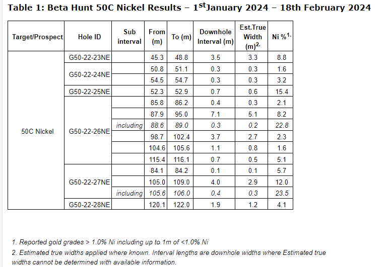 "Over all, the initial results from the ongoing nickel infill and extensional drilling program bode very well for the next update of the Beta Hunt nickel mineral resource, expected in late 2024. The current total Beta Hunt mineral resource is 22,300 contained nickel tonnes in M&I category and 13,400 contained nickel tonnes in inferred mineral resources."