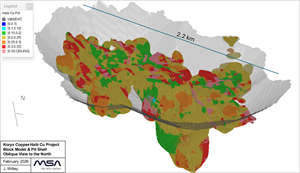 The model incorporated interpreted structural trends and geological domains that influence the mineralisation (Figure 1). The copper grade was estimated using the accepted historical and all Koryx data. Estimation of the grade of a three-dimensional block model was performed by ordinary kriging of five metre composite sample copper grades using Leapfrog Edge software. An average in-situ dry bulk density value of 2.78 t/m3 was assigned to all blocks.