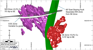 Figure 1. Plan view illustrating >0.2% Cu grade shells in the NW and SE zones and major structures