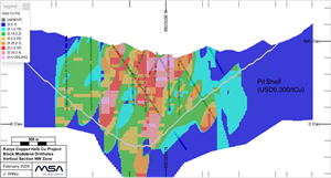 Figure 5. Section through Haib resource block model, drillholes and pit shell – NW Zone, view to the northwest