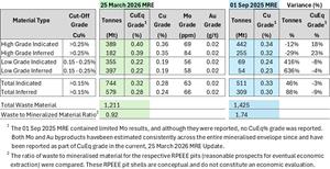 - This updated MRE reflects (i) a significant increase in copper equivalent grade (CuEq%) mainly due to the inclusion of molybdenum (“Mo”) and gold (“Au”) by-products (ii) a significant increase in mineralised low-grade tonnage (iii) a significant increase in total contained Cu, Mo and Au and (iv) a significant reduction in stripping ratio.