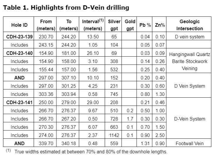Kootenay's president and chief executive officer, James McDonald, stated: "We are pleased that our planned drilling is intersecting D vein consistently at expected target depths with a 100-per-cent hit rate to date for the D vein. The widths and grades we are seeing at D vein are extremely encouraging and support our belief in the potential of defining a significantly sized silver resource. We are also starting to intersect additional mineralized veins flanking the main mineralized vein."