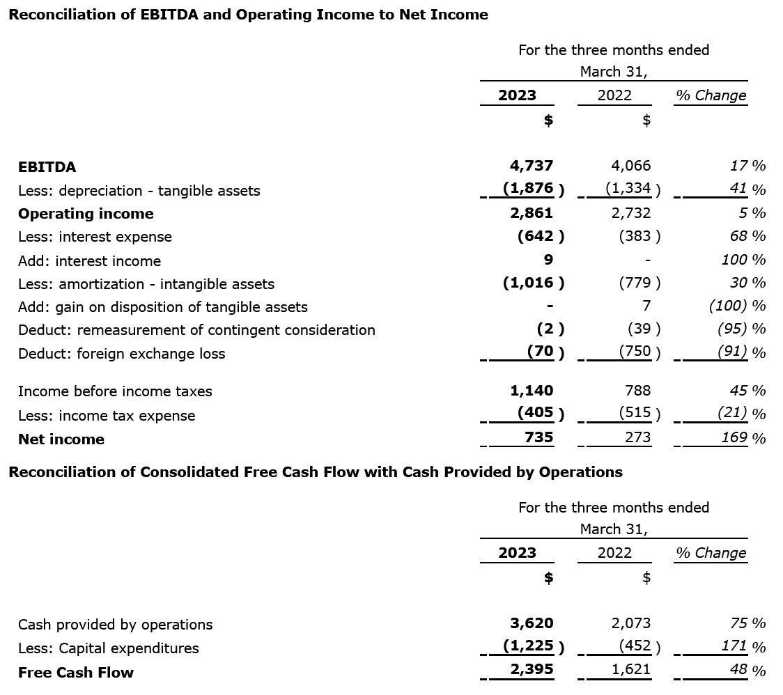 Free Cash Flow for Q1 2023 was $2.4 million CAD, growing $0.8 million CAD, or 48% versus Q1 2022, driven by higher cash generated from operating activities from higher EBITDA and more favourable changes in non-cash operating working capital, partially offset by higher capital expenditures to support the Company's growth.