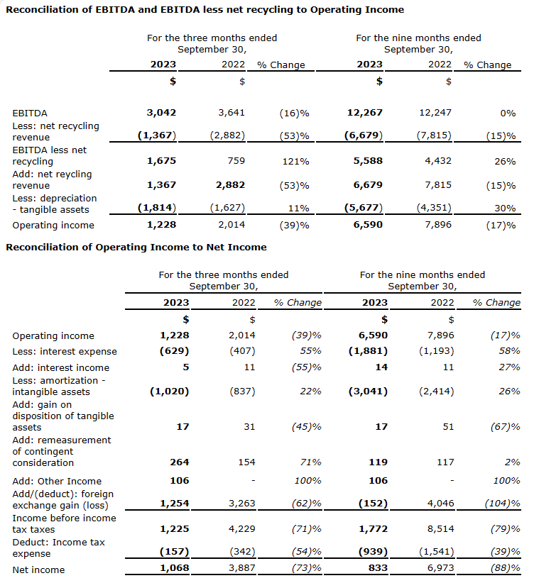 Consolidated EBITDA (earnings before interest, taxes, depreciation and amortization), excluding the impact of net recycling revenue, was $1.7-million, growing by $900,000 or 121 per cent versus Q3 2022.