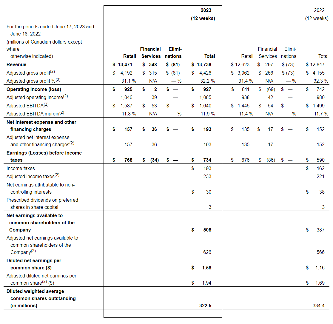 - Adjusted gross profit was $4,192-million, an increase of $230-million, or 5.8 per cent. The adjusted gross profit percentage of 31.1 per cent decreased by 30 basis points (2022: increased by 50 basis points). Retail margins declined slightly, primarily driven by higher shrink and higher supplier costs that were not passed on to consumers.