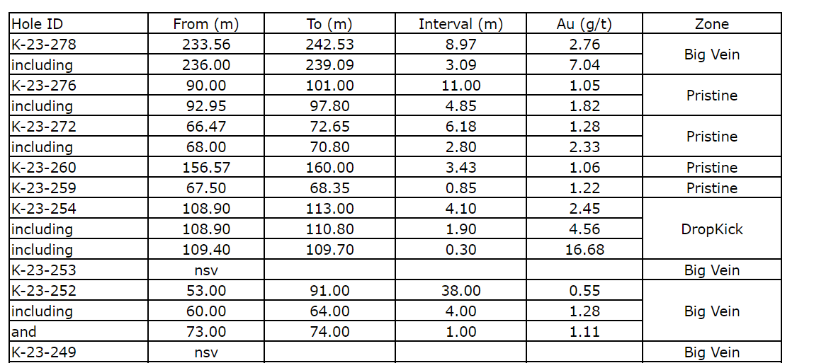Continuing drilling at the Big vein intersected 2.76 g/t Au over 8.97 metres from 233.56 metres, including 7.04 g/t over 3.09 metres, in hole K-23-278.