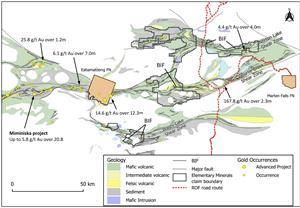 Map of the Watson Project showing the location of the Ring of Fire Road, gold occurrences, major shear zones and banded iron formation.