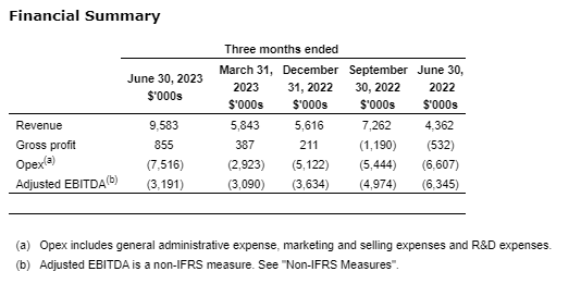 Adjusted EBITDA (earnings before interest, taxes, depreciation and amortization) of negative $3.2-million, an improvement of $3.2-million or 50 per cent versus Q2 2022 and remaining consistent with Q1 2023 despite the incorporation of Vivo which historically had an adjusted EBITDA of negative $2-million per quarter;