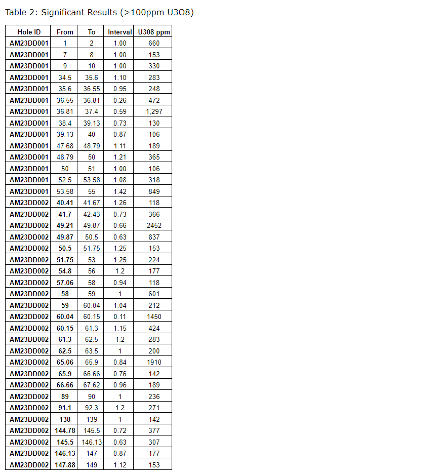 The 2023 exploration drilling program commenced at Amphitheatre uranium prospect and comprises nine holes for a total of 855.8 m diamond drilling. Assay results from the first two holes at Amphitheatre, AM23DD001 and 002, have been received, highlights include: