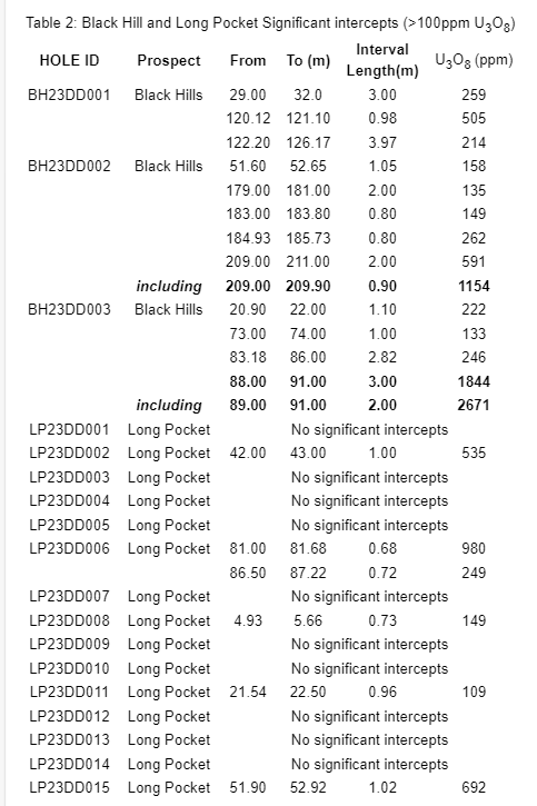 Importantly, results from drill holes LP23DD-002, -008 and -011 present immediate stepouts of over 100 m from known shallow, flat-lying mineralization, whilst LP23DD-006 and -015 suggest a potential mineralized corridor to the Black Hills uranium prospect which requires further investigation in the year ahead.