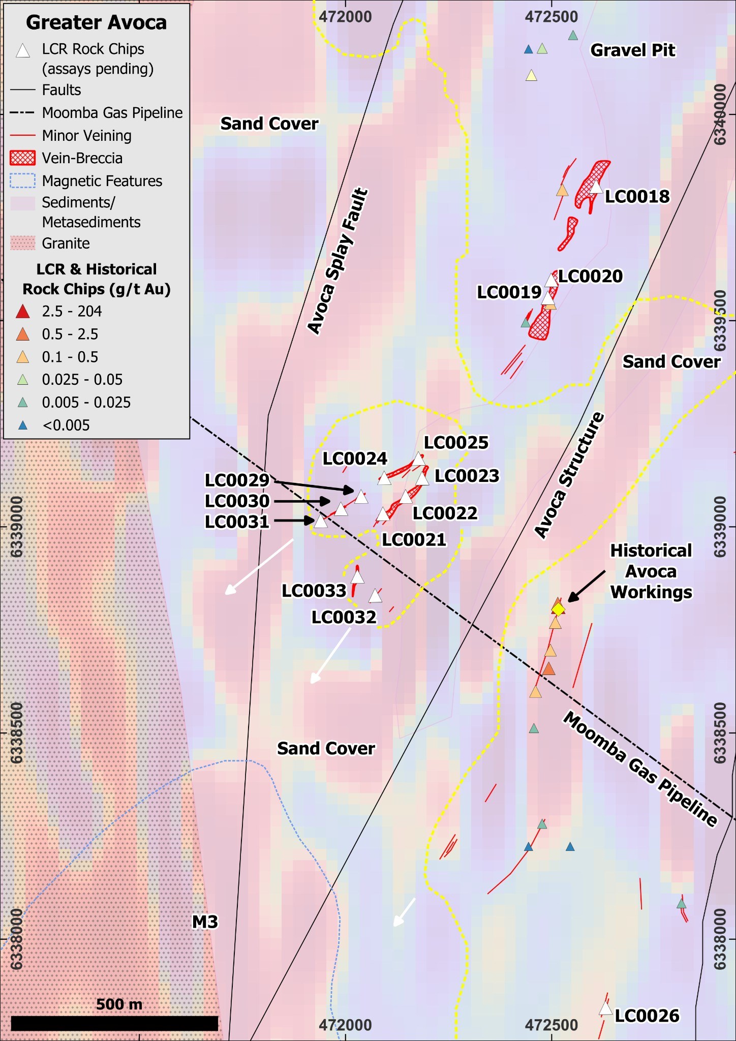 Northeast-southwest orientation of veining across Greater Avoca indicates it is controlled by the Lancaster-named Avoca Structure and Avoca Splay Fault, which trend obliquely to the prospective, undercover granite-sedimentary contact; notably, the strike-extensive Avoca Structure also intersects the northwest extension of LiDAR Target 1 and may exert a significant structural control on vein occurrence in the larger area.