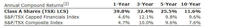 In addition, the fund intends to maintain the targeted monthly Class A share distribution rate at 7.5 cents per Class A share. The Class A Share has outperformed both the S&P/TSX Capped Financials Index and the S&P/TSX Composite Index over the past one-, three-, five- and 10-year periods. Over the past 10-year period to Jan. 31, 2024, the Class A share has delivered an 11.6-per-cent-per-annum return, outperforming the S&P/TSX Capped Financials Index and the S&P/TSX Composite Index by 2.0 per cent per annum and 4.0 per cent per annum, respectively.