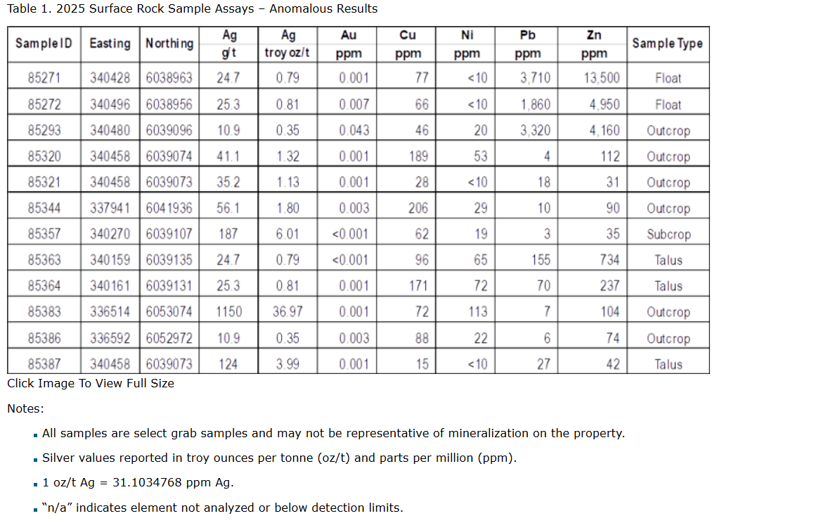 Surface rock sampling from the 2025 field program returned silver values ranging from 10.9 parts per million to 1,150 ppm (0.35 to 36.97 ounces per tonne Ag), accompanied by anomalous base metals: