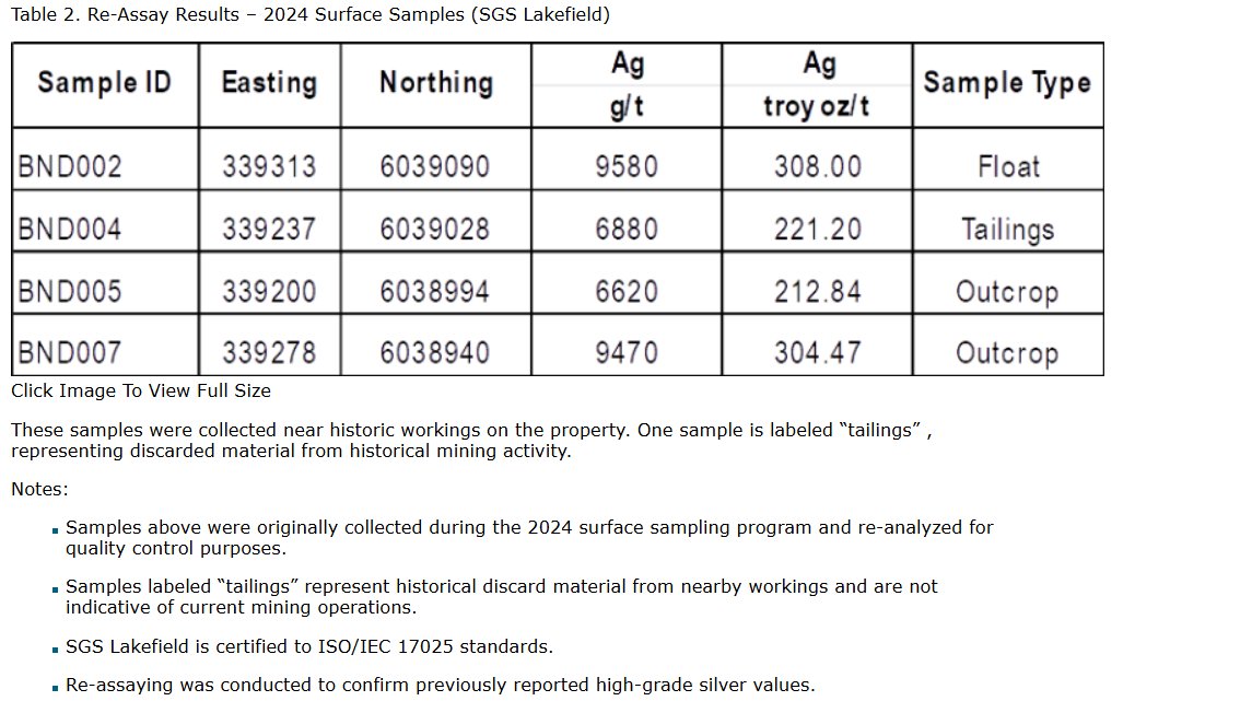 To reconfirm these high-grade results, four representative samples from the 2024 program were reassayed at a second independent laboratory in 2025 and confirmed silver values ranging from 212.84 to 308.00 oz/t. The samples were analyzed by SGS Canada Minerals, Lakefield, using SGS Method GC_FAG32V (30 g fire assay for silver). SGS Lakefield operates in accordance with ISO/IEC 17025 standards. Table 2 summarizes the results.
