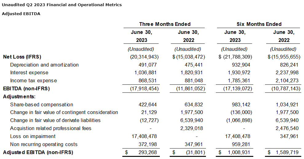 Adjusted EBITDA (earnings before interest, taxes, depreciation and amortization) of $293,300 for the three months ended June 30, 2023, and $1-million for the six months ended June 30, 2023.