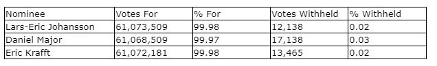 Lars-Eric Johansson, Daniel Major and Eric Krafft were re-elected to serve as directors of the company, with the percentage of votes cast for each director as shown in the attached table.