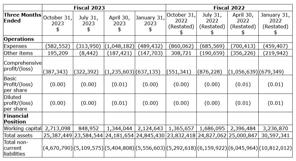 During the three months ended Oct. 31, 2023, the company reported a net loss of $387,343 compared with a reported net loss of $322,392 for the three months ended July 31, 2023, an increase in loss of $64,951, Major movements are in shares based compensation booked during Q4 2023 of $46,683 compared with nil in Q3 2023 , Accretion of provision for site restoration booked during Q4 2023 of $74,428 compared with $10,200 in Q3 2023, which is offset by foreign exchange gain booked during Q4 2023 of $125,700 compared with loss of $51,554 in Q3 2023 and interest booked during Q4 2023 of $26,959 compared with $9,047 in Q3 2023.