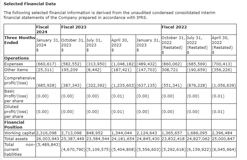 During the three months ended Jan. 31, 2024 (Q1 2024), the company reported a net loss of $685,928 compared with a reported net loss of $387,343 for the three months ended Oct. 31, 2023 (Q4 2023), an increase in loss by $298,585, the increase in loss mainly due to share based compensation expenses of $159,472 (Q4 2023 -- $46,683), foreign exchange gain $35,971 (Q4 2023 -- gain $125,700) and net mark to market adjustment loss of $86,074 (Q4 2023 -- gain $42,550).