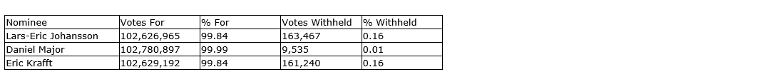 Lars-Eric Johansson, Daniel Major and Eric Krafft were re-elected to serve as directors of the company, with the percentage of votes cast for each director detailed in the attached table.