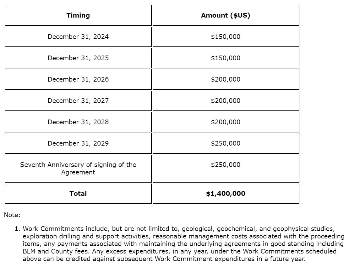 The term sheet requires Lahontan to make payments totalling $1.8-million (U.S.) over a seven-year period to Emergent, back-end loaded (please see details of the term sheet herein) to exercise an option to acquire a 100-per-cent interest in the 11.8-square-kilometre property. The option payments (except the $10,000 signing payment) can be made in a combination of cash and shares at Lahontan's discretion. In addition, the company will commit to exploration expenditures totalling $1.4-million (U.S.) over the same seven-year period, these expenditures that should be sufficient to define an initial mineral resource estimate for West Santa Fe. The initial option payments and work commitments can be easily accommodated by Lahontan's current cash position and budget.