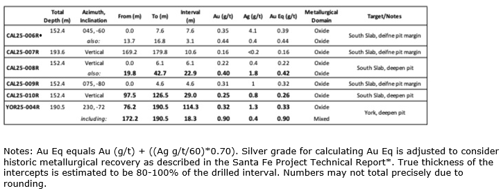 Drill holes CAL25-008R and 010R were designed to test for deeper, stacked zones of oxide gold mineralization at the south end of the Slab pit. Both drill holes cut oxide gold zones with gold grades similar to that reported in this portion of the Slab pit MRE. The other drill holes reported herein (CAL25-006R, 007R and 009R) were needed to define the suspected limits to shallow gold mineralization along the margin and bottom of the Slab deposit and better constrain potential pit boundaries for future mine planning.