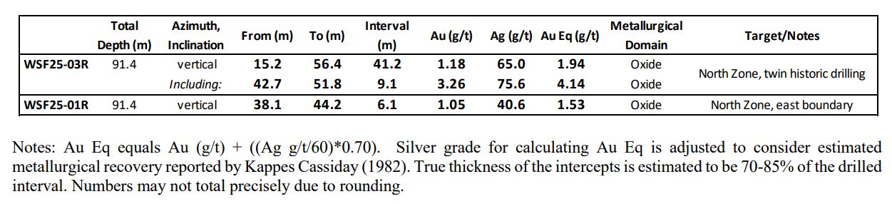 - WSF25-03R: 41.2 metres (15.2 to 56.4 m) grading 1.94 grams per tonne gold equivalent, including 9.1 metres (42.7 to 51.8 m) grading 4.14 g/t AuEq -- a shallow intercept of oxide gold and silver mineralization with a high-grade core of 4.14 g/t AuEq: