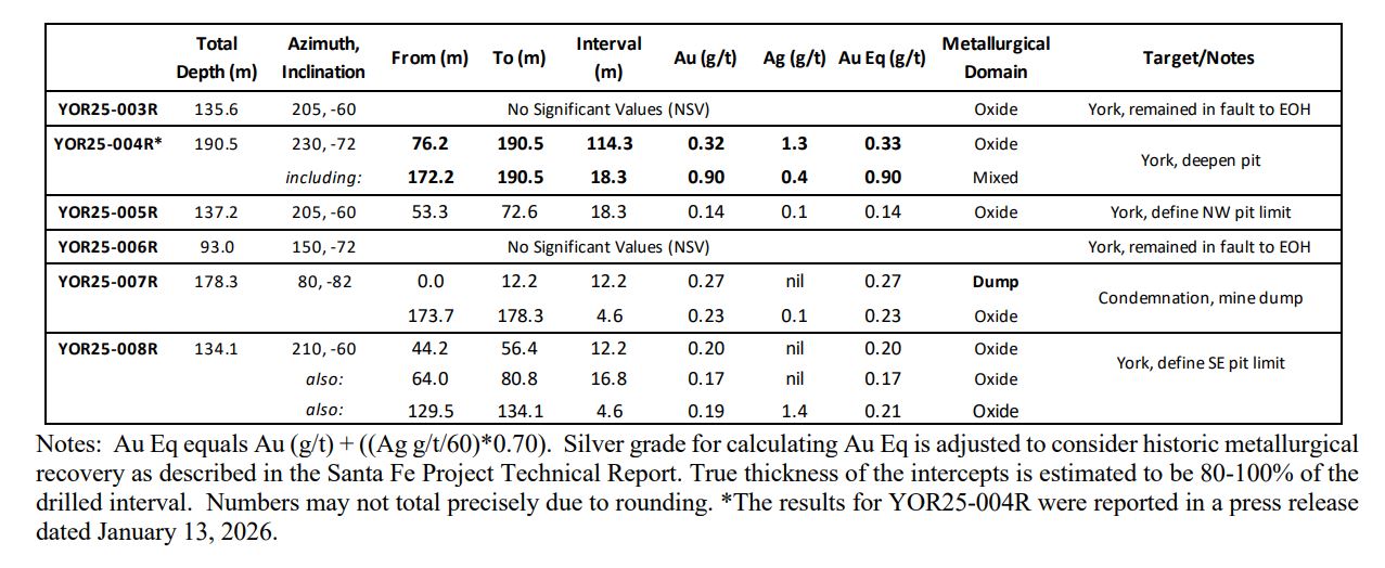 The company has also received analytical results for the final five RC drill holes completed at the York deposit, part of the company's Santa Fe mine project. Two of the drill holes were lost in a fault zone and therefore abandoned due to difficult drilling conditions (YOR25-003R and YOR25-006R), while two of the remaining three holes specifically targeted the margins of the York system for use in mine planning and to determine the potential margins of a future open pit (YOR25-005R and YOR25-008R).