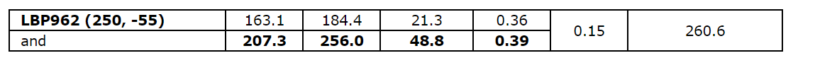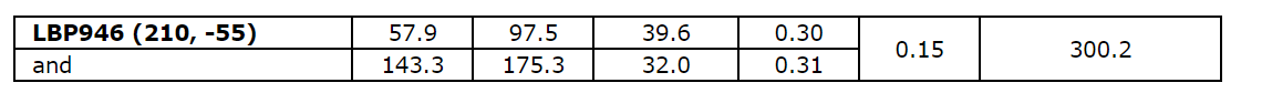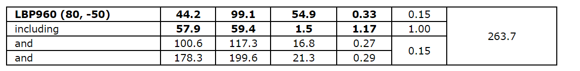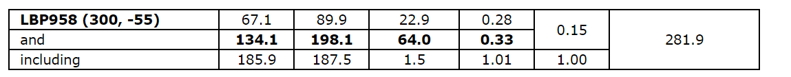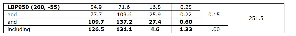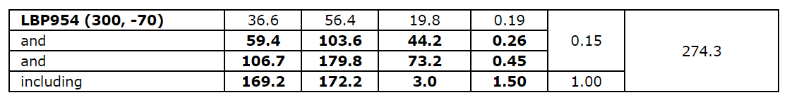 0.45 g/t Au over 73.2 m, including 1.50 g/t Au over 3.0 m, in hole LBP954.