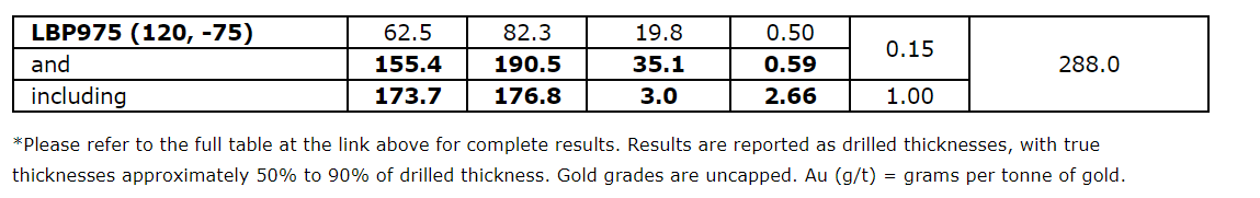 0.61 gram per tonne gold over 76.2 metres, including 2.47 g/t Au over 12.2 m, in hole LBP941;