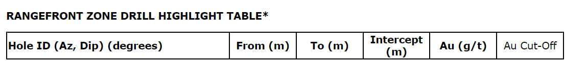 Drill results from 15 additional RC drill holes completed in the Rangefront zone have been received, with results confirming that the newly discovered extension to high-grade mineralization shows strong lateral continuity over a large area. These infill holes were drilled to convert currently classified inferred resource blocks to indicated resource blocks, and to further define the thick, near-surface zones of oxide gold mineralization discovered on the eastern margin of the Rangefront zone earlier in the year (see press release dated Sept. 7, 2023). This area remains open and is a key target for the next phase of resource expansion drilling in 2024.