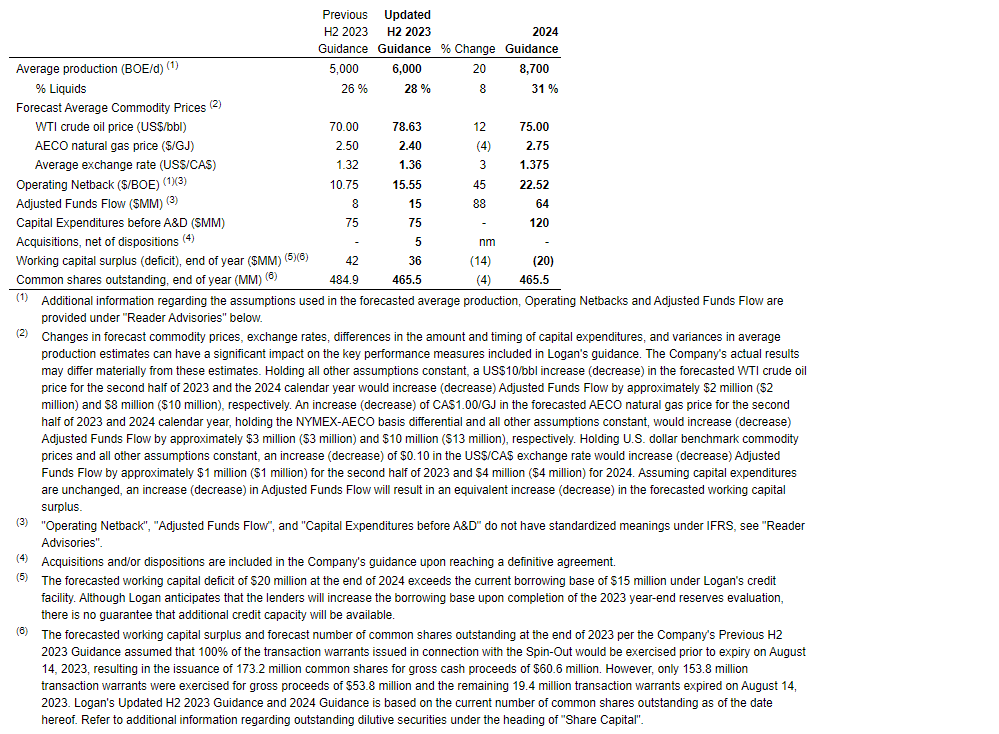 The increase in average production forecast for H2 2023 to 6,000 BOE per day is reflective of new wells drilled both exceeding initial production type curves, as well as these wells coming on production earlier than originally estimated. The forecasted working capital surplus for year-end 2023 decreased as a result of 19.4 million transaction warrants that expired unexercised (which resulted in less dilution to the share count than originally anticipated), as well as unbudgeted land acquisitions completed by the company, offset by the forecasted increase in adjusted funds flow. The 2024 budget of 8,700 BOE per day assumes all new pads come on stream in mid 2024; Logan expects to exit 2024 above 10,000 BOE per day (Q4 average production).