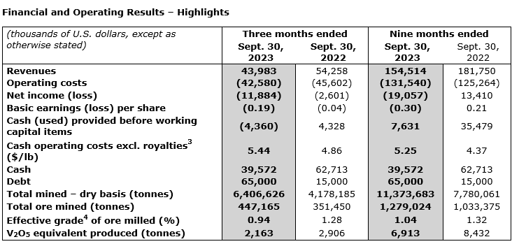 Revenues of $44.0-million versus revenues of $54.3-million in Q3 2022; decline driven by lower vanadium prices and lower vanadium sales volumes; revenues per pound sold of V2O5 equivalent of $8.34 versus $8.80 in Q3 2022;