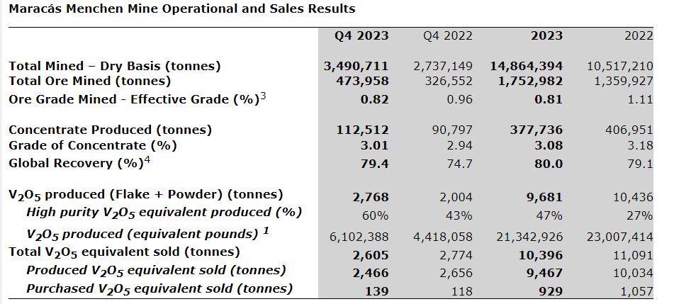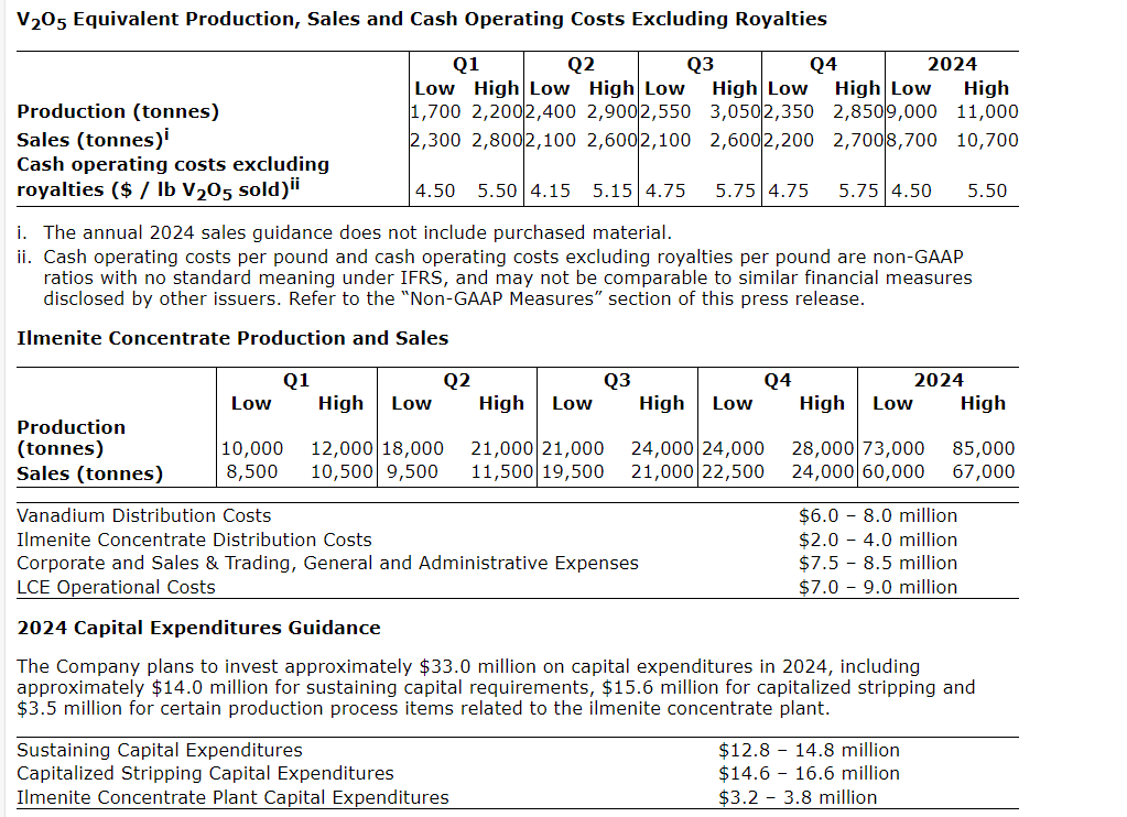 Tables summarizing the company's 2024 production, sales and cost guidance are provided herein. The company expects lower V2O5 equivalent production in Q1 2024 due to a planned kiln refractory replacement in February, 2024.