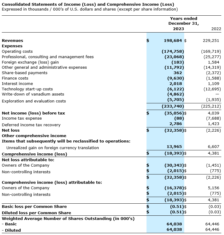 The company recorded a net loss of $32.4-million in 2023, compared with a net loss of $2.2-million in 2022, largely driven by a 13-per-cent decrease in revenues and an increase in certain expenses, most notably a 3-per-cent increase in operating costs, a 506-per-cent increase in finance costs, a 195-per-cent increase in exploration and evaluation costs, and a writedown of vanadium assets of $4.9-million.