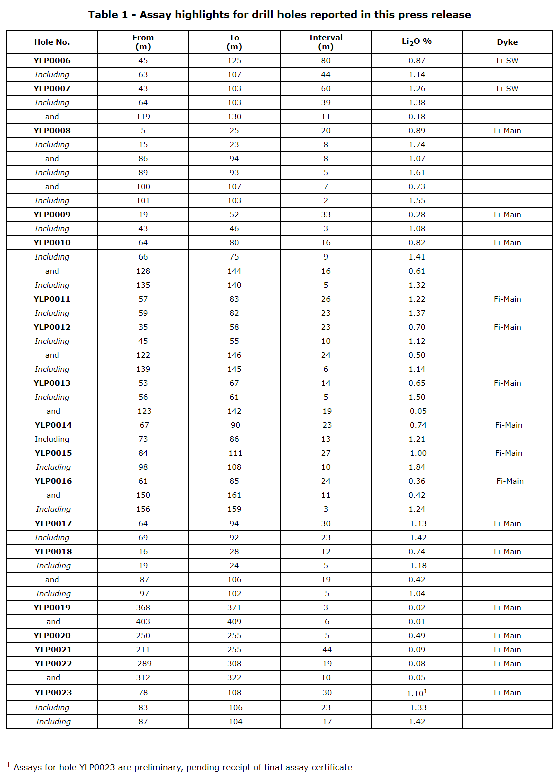 - YLP0023: 30 m at 1.10 per cent Li2O, including 23 m at 1.33 per cent Li2O (Fi Main).