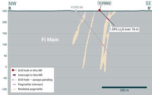 Cross-section of YLP0062 which intersected 16 metres at 1.24% Li2O in the Fi Main pegmatite dyke.