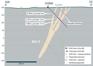 YLP0058 was drilled into the BIG East pegmatite swarm, which comprises a 35-80 m wide corridor of parallel-trending dykes that dips 65°-70° degrees west and extends for at least 1,000 metres along surface and 200 metres downdip.