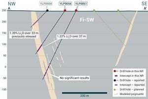 Figure 3 – Cross-section of YLP0054 which intersected the Fi Southwest pegmatite dyke with a 37 m interval of 1.22% Li2O.