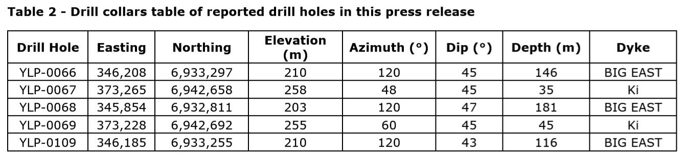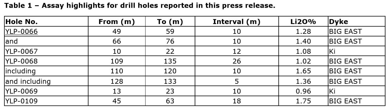 Francis MacDonald, CEO of LIFT comments, "We are pleased to see more very high-grade results coming from BIG East. Last week we released holes YLP-0092 which intersected 18 metres at 1.79% Li2O which is located in the southwestern portion of the dyke system. This week's highlight of 18 metres at 1.75% Li2O in hole YLP-0109 is located in the northeastern portion of the dyke swarm, almost 500 metres away. This shows the potential to have multiple high-grade zones within the BIG East pegmatite system."