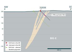 Figure 3 – Cross-section of YLP-0109 which intersected the BIG-East pegmatite dyke with an 18 m interval of 1.75% Li2O.