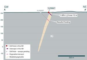 Cross-section illustrating YLP-0067 with results as shown in the Ki pegmatite dyke with a 12 m interval of 1.08% Li2O.
