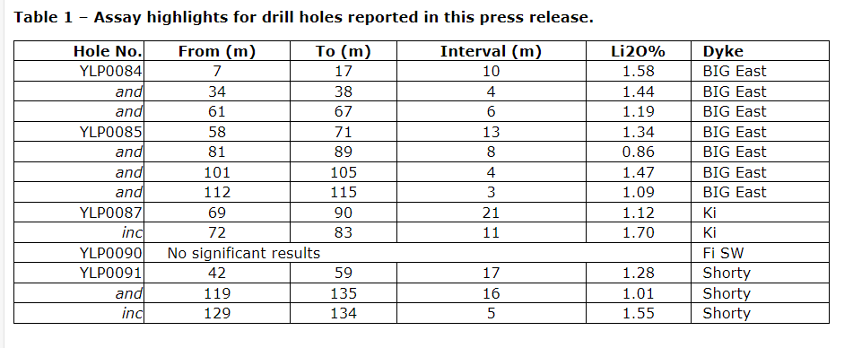 This week's drill results are for five holes from four different pegmatite dikes, including BIG East (YLP-0084, 85), Ki (YLP-0087), Fi Southwest (YLP-0090) and Shorty (YLP-0091).