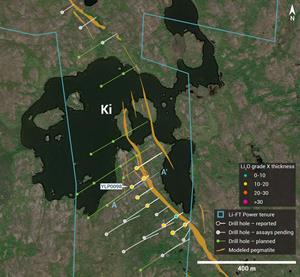 Plan view showing the surface expression of the Ki pegmatite with diamond drill holes reported in this press release.
