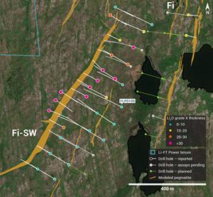 The Fi Southwest (SW) pegmatite is one of several dykes occurring within a north-of-northeast striking dyke corridor. Drilling at Fi SW shows that it ranges from a single 20-40 m wide dyke to 2-3 dykes of similar cumulative width within a 50-70 m wide corridor. The Fi SW dykes are visible for at least 1,100 m on surface and dips 60°-80° to the east-southeast, with drilling date showing at least 150 m of downdip continuity along 550 m of strike.