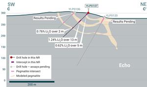 Figure 3 – Cross-section of YLP-0107 which intersected the Echo pegmatite dyke with a 13 m interval of 1.24% Li2O.