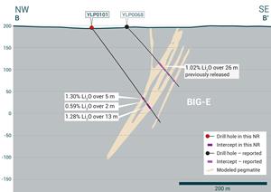 Cross-section illustrating YLP-0101 with results as shown in the BIG East pegmatite dyke with a 13 m interval of 1.28% Li2O.