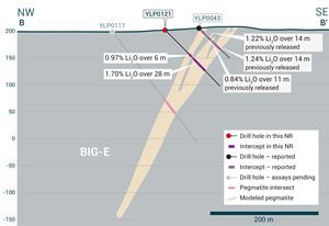 Cross-section of YLP-0121 which intersected the BIG East pegmatite dyke with a 28 m interval of 1.70% Li2O.