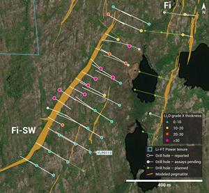 Plan view showing the surface expression of the Fi SW pegmatite with diamond drill holes reported in this press release.