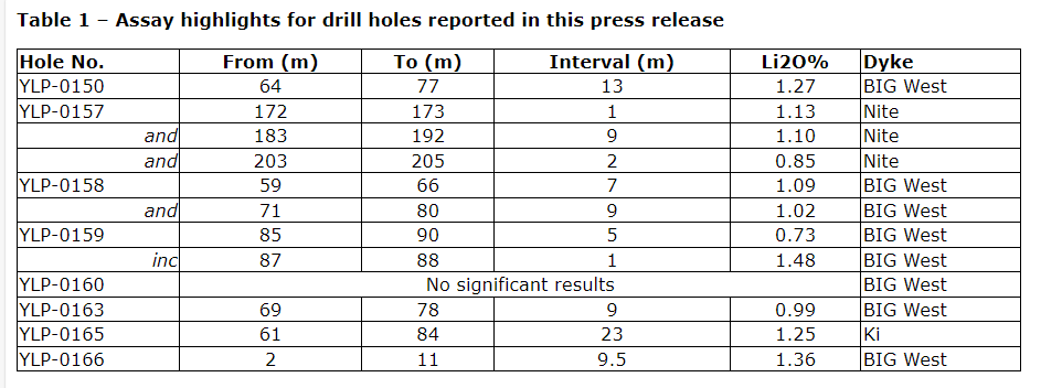 • YLP-0150: 13 m at 1.27 per cent Li2O (BIG West);
